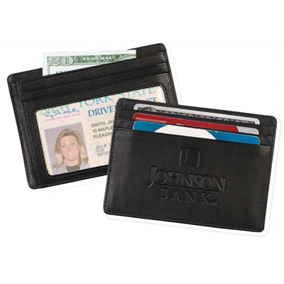 These wallets are made from hand-worked European leathers. This super slim wallet has two card pockets, a leather-lined center pocket for bills, and a window outside to permanently display your I.D. Its lack of metal also makes it ideal for airport security.